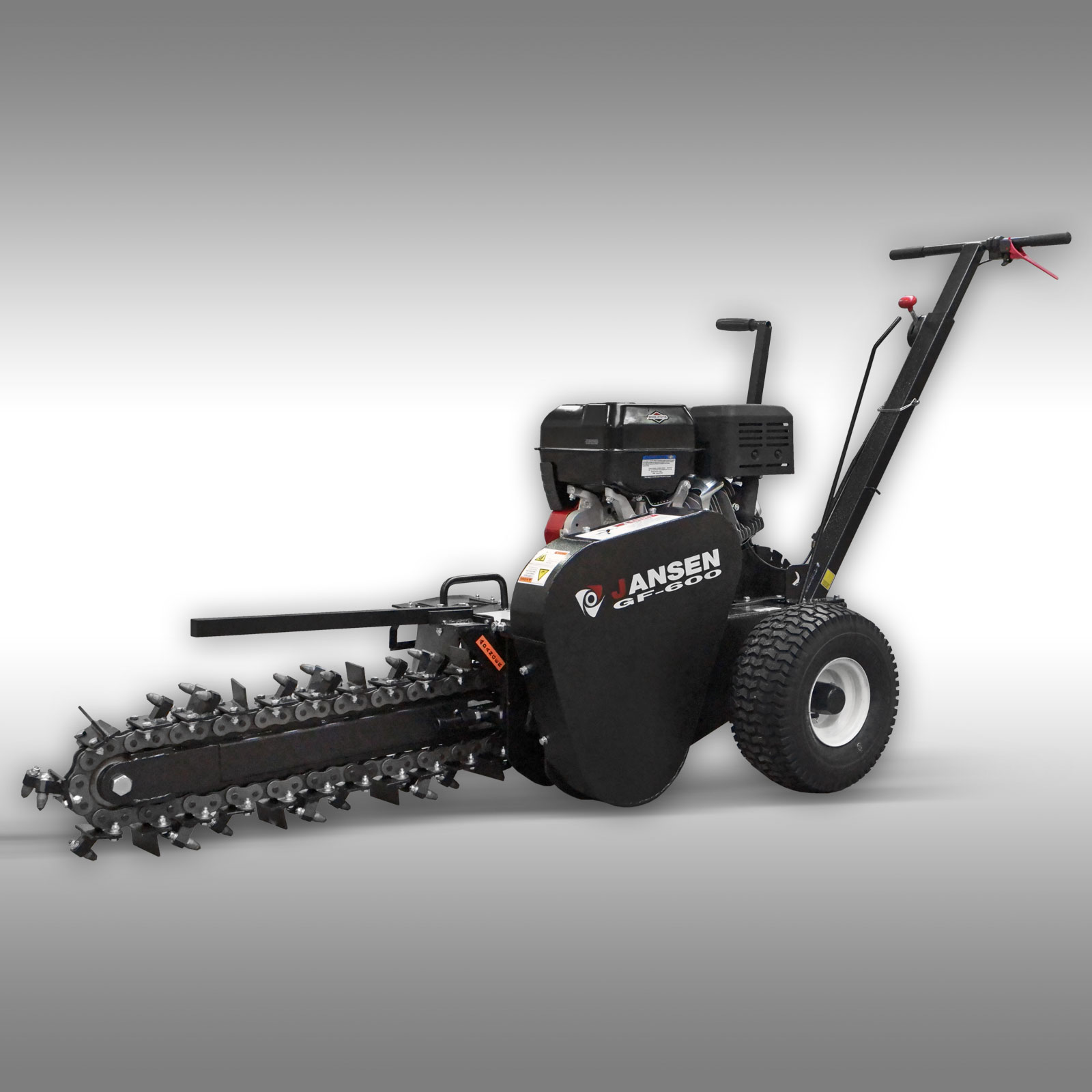 ZANJADORA GF-600PRO-POTENTE MÁQUINA AUTOPROPULSADA CON MOTOR BRIGGS & STRATTON DE 13,5 HP, IDEAL PARA ABRIR ZANJAS PRECISAS PARA CABLES, TUBERÍAS Y RIEGO. PERMITE EXCAVAR HASTA 60 CM DE PROFUNDIDAD Y 10 CM DE ANCHO, CON UN RENDIMIENTO DE HASTA 60 M POR HORA. SU CADENA CON DIENTES DE CARBURO GARANTIZA DURABILIDAD INCLUSO EN SUELOS DUROS. COMPACTA Y MANIOBRABLE, PERFECTA PARA TRABAJOS PROFESIONALES EN ESPACIOS REDUCIDOS.