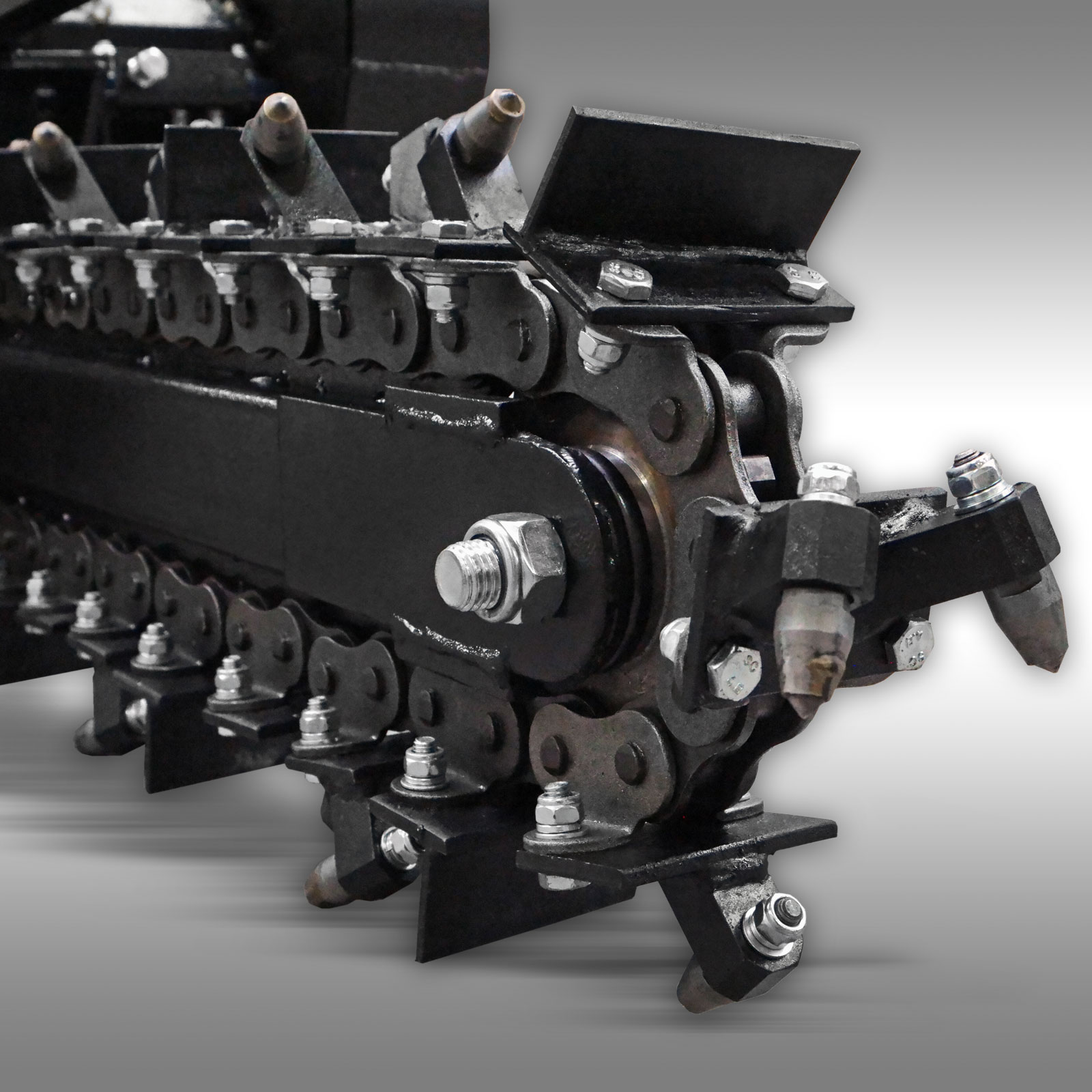 La cadena de fresado con las 27 cuchillas de fresado de aleación de carburo está atornillada a la robusta cadena de excavación y puede sustituirse individualmente. La hoja larga permite una profundidad máxima de fresado de 60 cm. El material excavado se transporta lateralmente mediante un transportador de tornillo. Es posible una velocidad de excavación de hasta 60 m por hora.